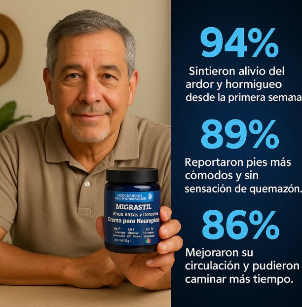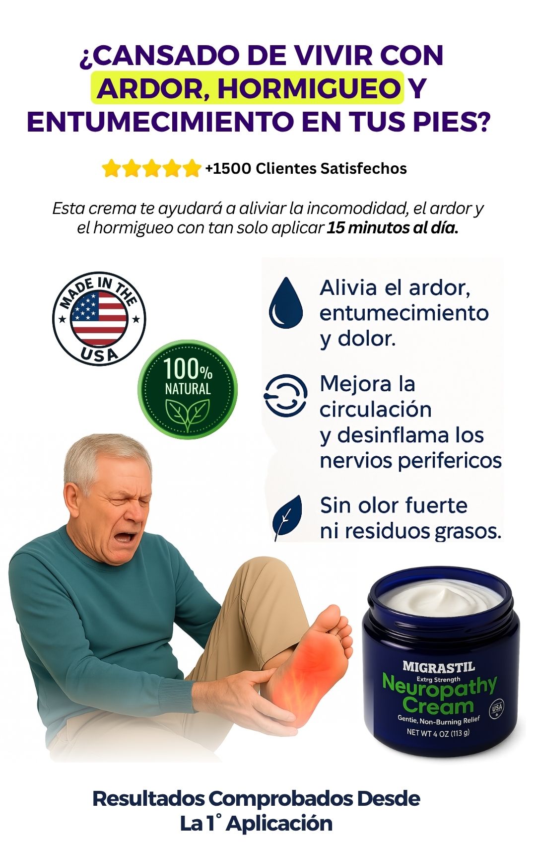 Si sufres de neuropatía diabética, calambres o adormecimiento en las piernas o pies, con solo una aplicación denuestra revolucionaria crema de magnesio, comenzará a sentir una reducción en las sensaciones de ardor y hormigueo y entrará en un estado de comodidad y alivio.