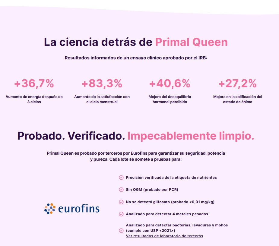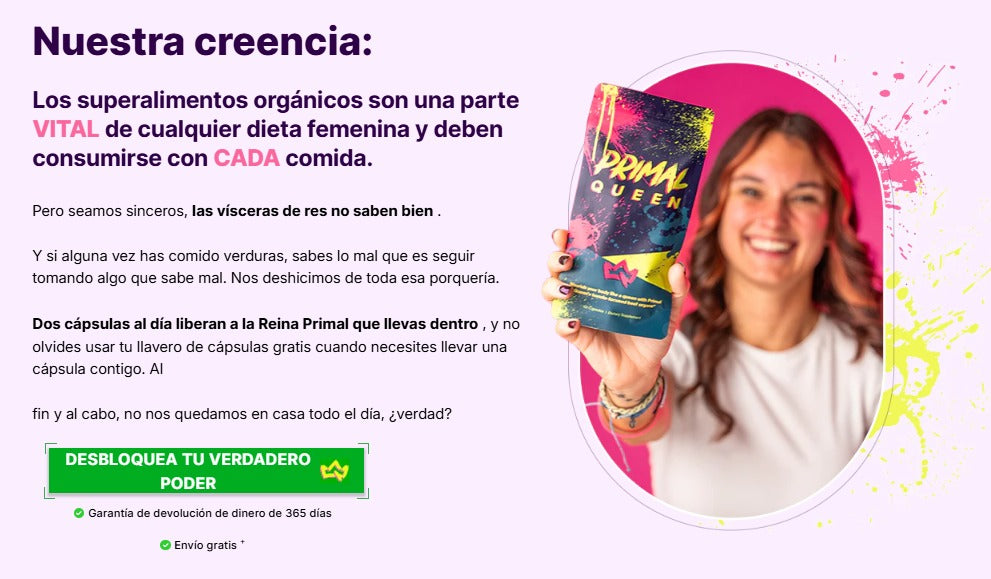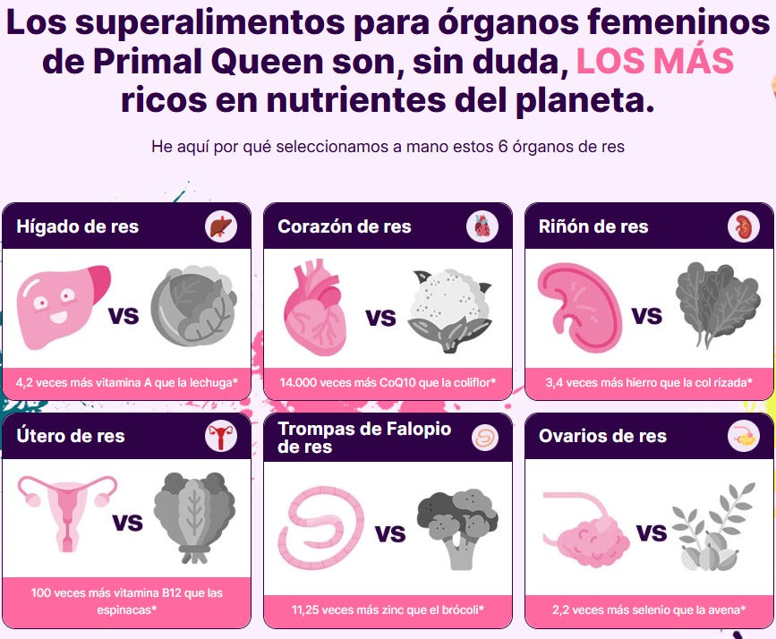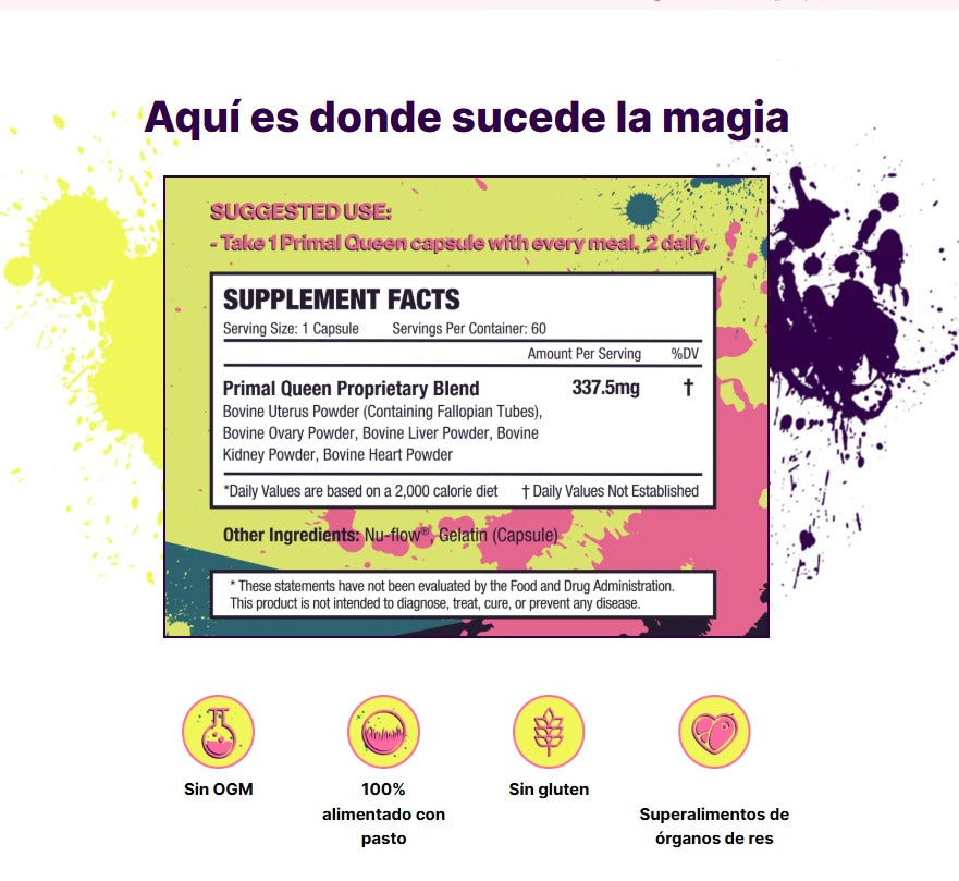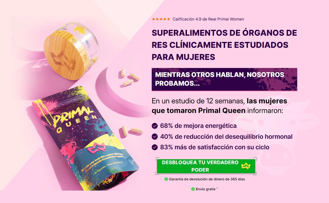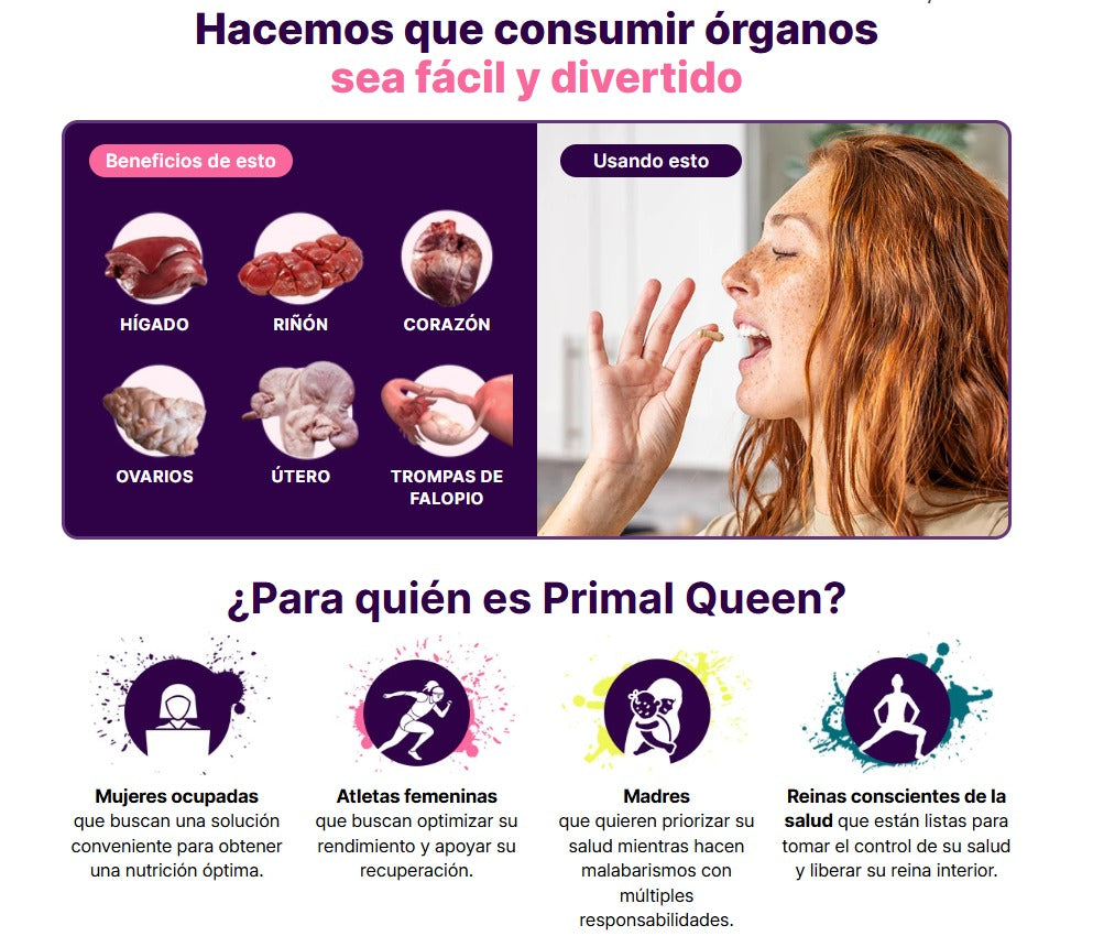 Primal Queen está formulado exclusivamente para proporcionar una amplia gama de nutrientes esenciales específicamente diseñados para la salud femenina. Si bien ofrece muchas de las vitaminas y minerales que suelen encontrarse en los multivitamínicos, sus nutrientes orgánicos lo distinguen como un suplemento único. Su rica concentración de vitamina B12, hierro, zinc y otros nutrientes lo convierte en un excelente complemento para la dieta. Sin embargo, como las necesidades y los objetivos de salud de cada persona son diferentes, siempre es recomendable consultar con un profesional de la salud.
